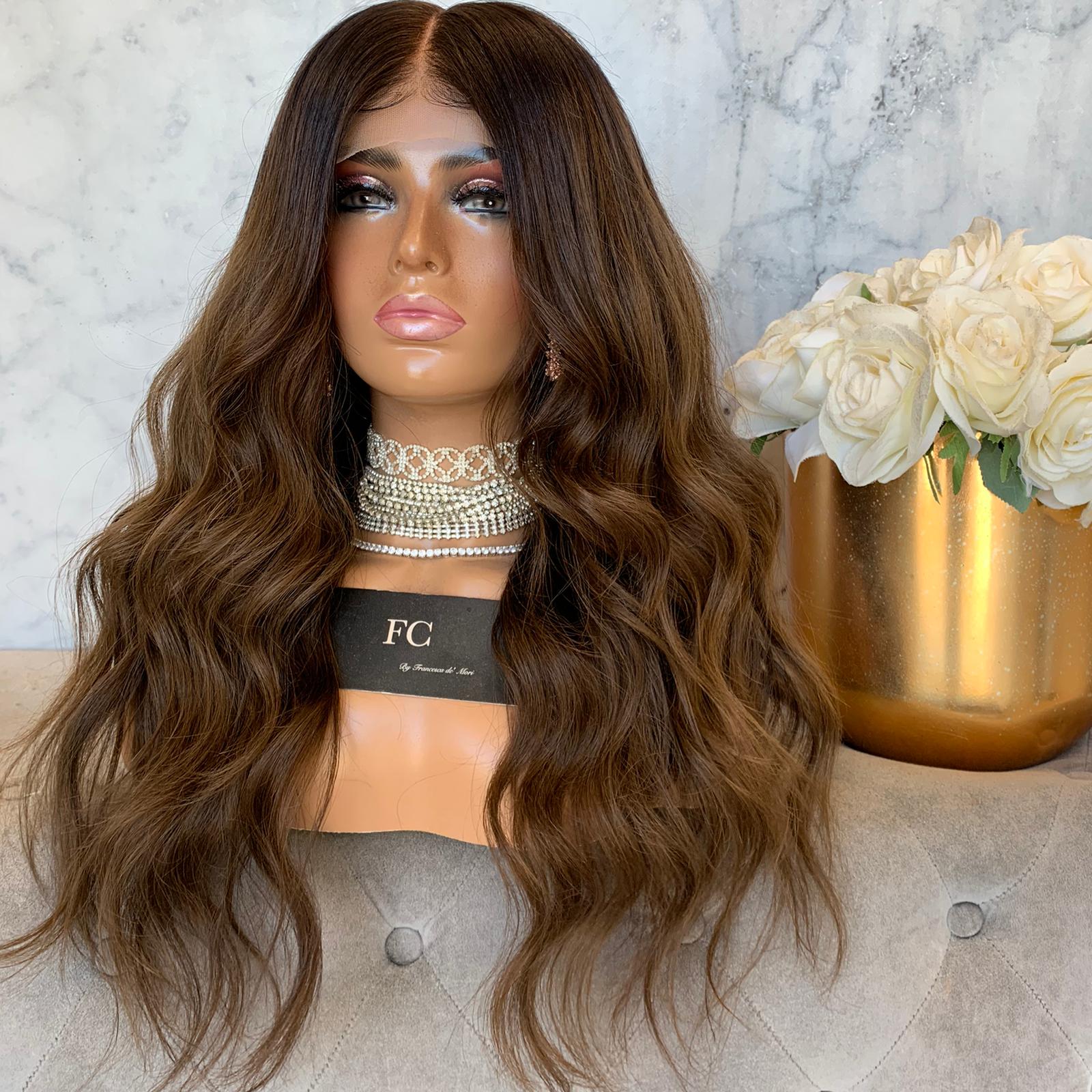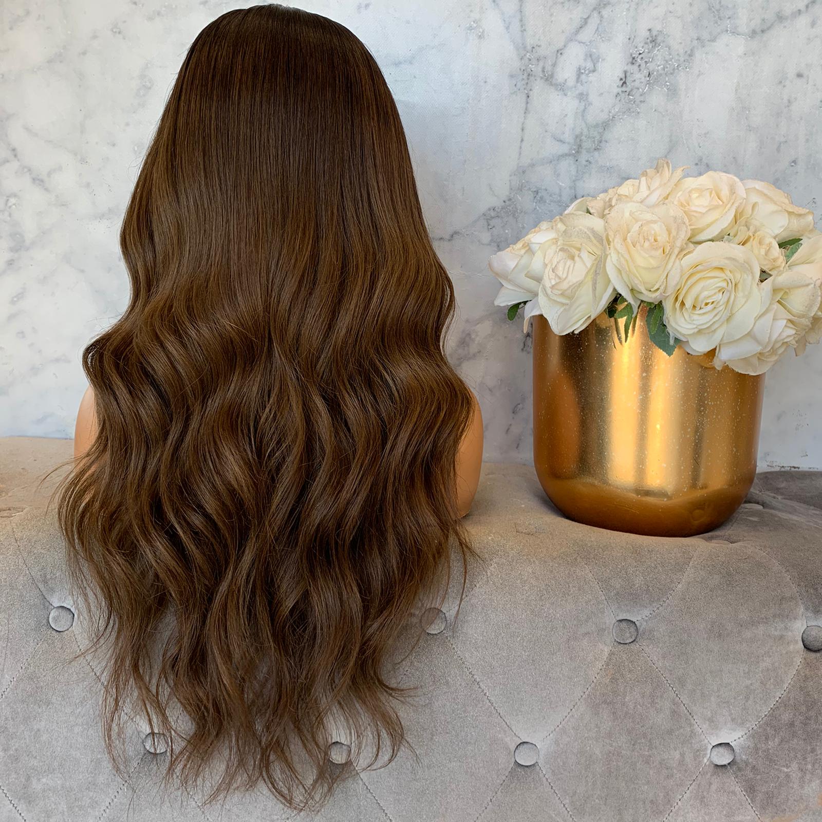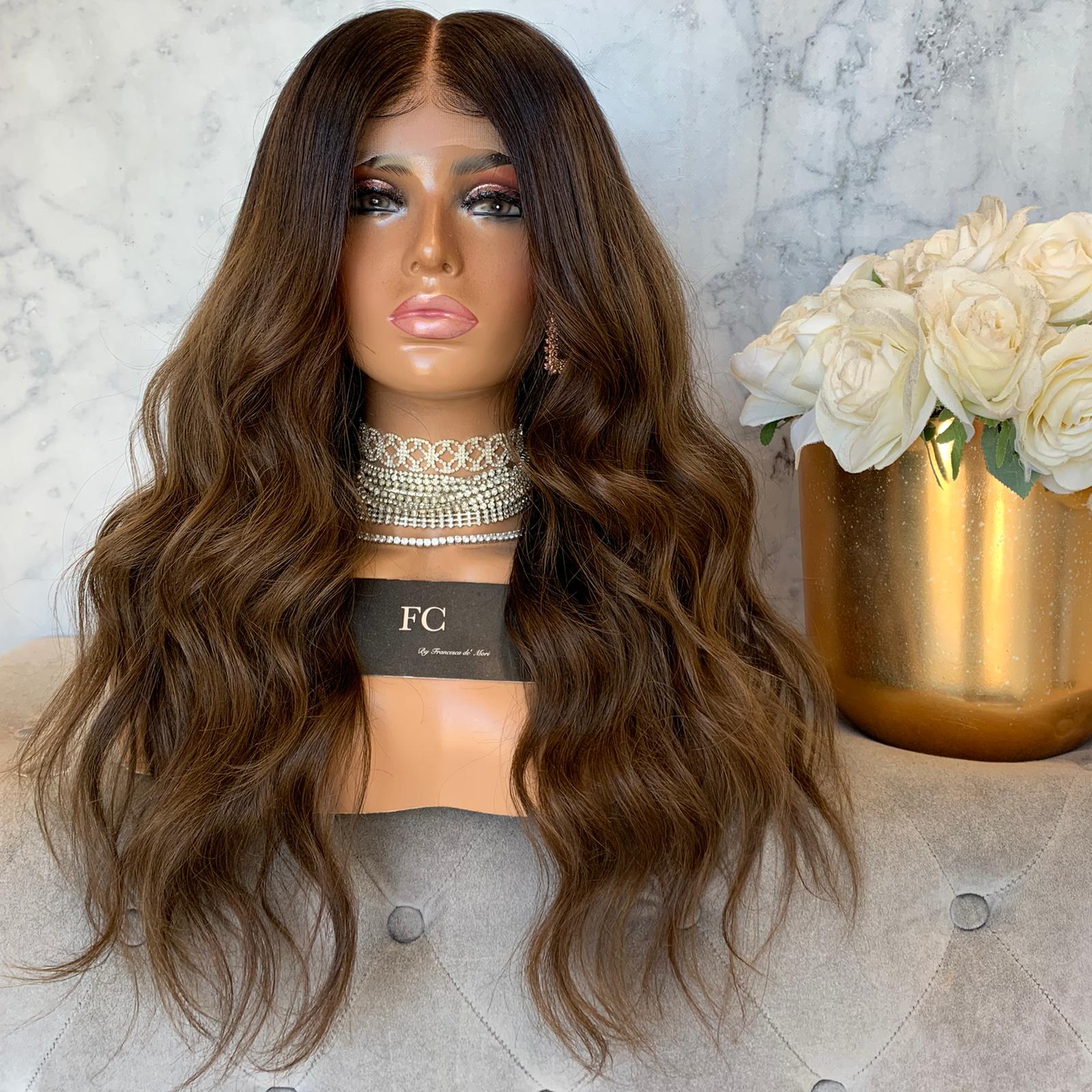 HER COLOUR: RAW VIRGIN CAMBODIAN CASHMERE ROOTS FADING INTO A COOL BROWN MID LENGTHS AND ENDS