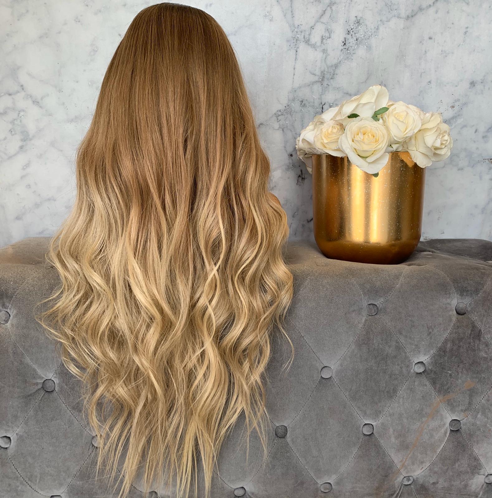 HER COLOUR: DARK BROWN OMBRÉ ROOT FADING INTO A SOFT GOLDEN COPPER WITH BRIGHT BLONDE ENDS